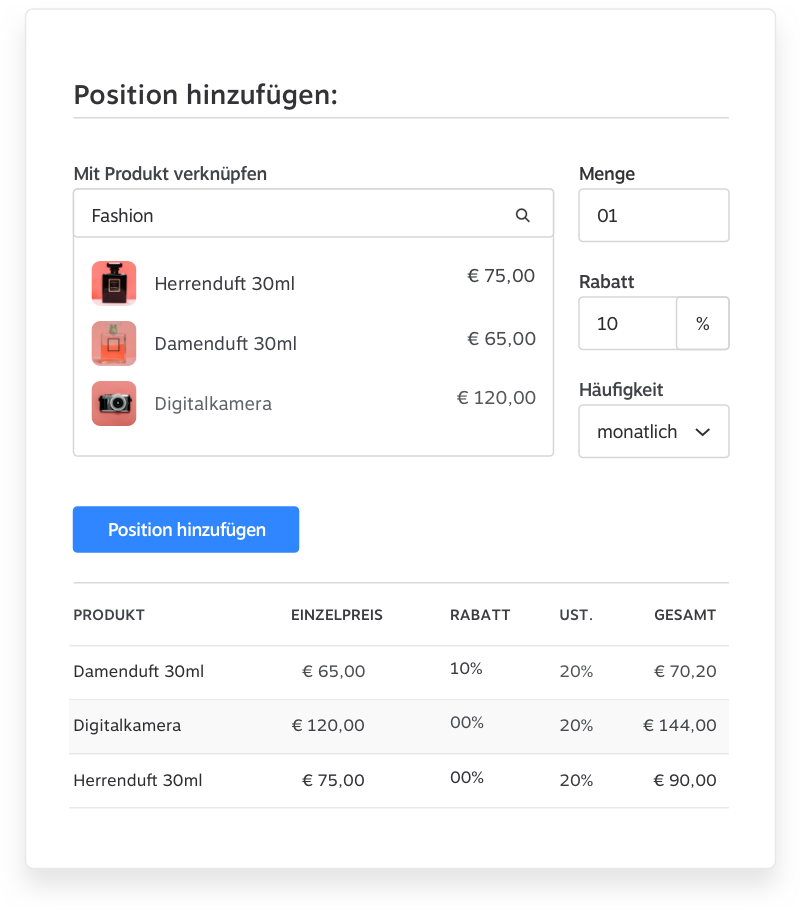 Mit unserem Rechnungsmodul kümmern Sie sich in Zukunft nicht länger um das manuelle Einfügen von Kundendaten, Rechnungspositionen, Rabatten oder das Layout Ihrer Rechnungen. Diese Arbeit übernimmt unser Konfigurator, während Sie sich auf die wichtigen Themen des Geschäftsalltags konzentrieren. Kurz gesagt, unsere Features machen Ihr Finanzwesen fortschrittlicher denn je.