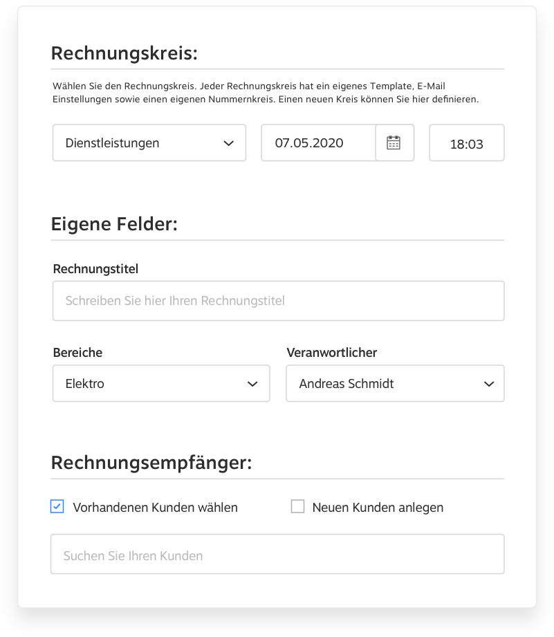Schritt für Schritt leitet Sie unser Konfigurator durch die Rechnungserstellung und braucht nur einen Klick, um aus Zahlen und Daten eine Rechnung in Ihrem Corporate Design mit fortlaufender Rechnungsnummer und stets aktuellen Kundendaten zu gestalten.